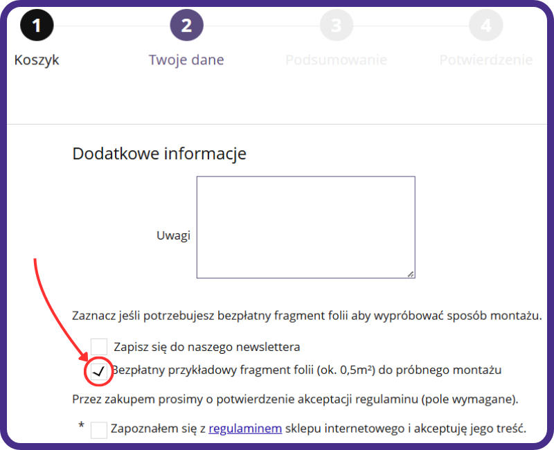 Do Twojego zamówienia możemy dodać bezpłatny fragment folii okiennej (ok. 0,5 m²), który możesz wykorzystać do próbnego montażu. Wystarczy zaznaczyć odpowiednie pole przy wypełnianiu swoich danych do wysyłki, a my wyślemy go do Ciebie wraz z zamówieniem.